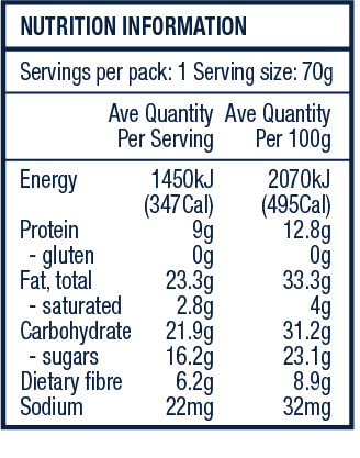 Ingredients: Seeds [sesame, sunflower, pumpkin, ground linseed], Almonds (17%), Dates, Coconut Sugar, Manuka Blend Honey, Hi-oleic Cold-pressed Sunflower Oil, Cacao (6%), Puffed Quinoa